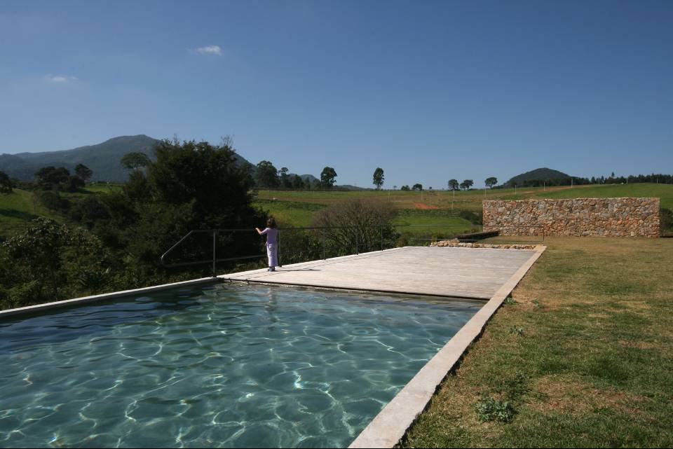 A casa se estende para o segundo platô, gramado, que está nivelado com a piscina. Locada na extremidade, estabelece continuidade visual de suas águas com a represa ao longe. A construção da piscina e respectivo solário, como um anexo, abriga abaixo o salão de jogos, um depósito e a casa de máquinas, que abrem para o terceiro platô.
